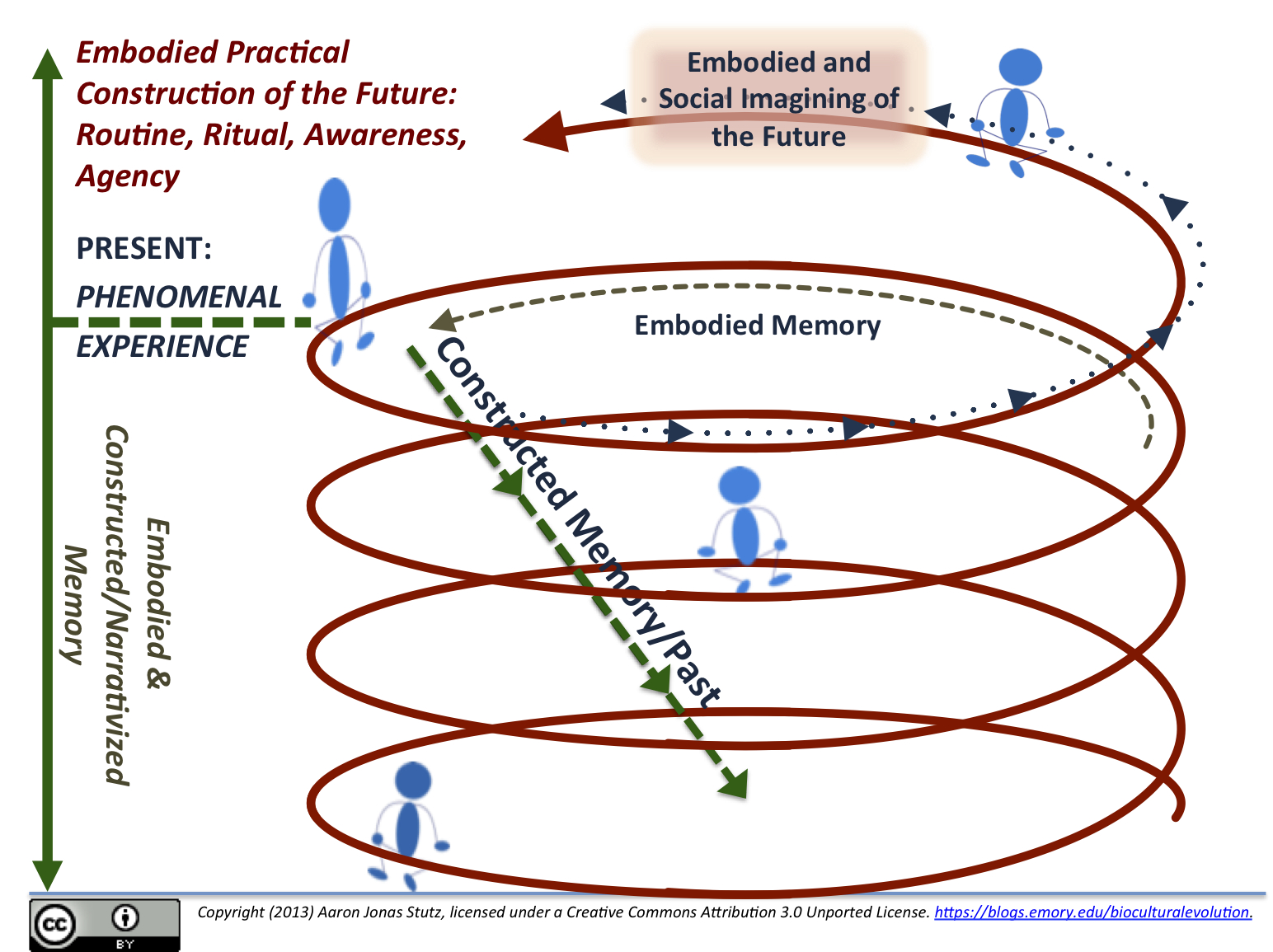 It should be clear that such embodied narratives can excite and focus our attention … specifically on the somatic/extrasomatic interface … and in a recursive way, on introspective attention on our being active agents in our surroundings. (Notice that if we start to introspect and speculate about infinite regress, we quickly lose focus on the importance that only this first recursive step has for maintaining awareness–supported by the embodied narrative–of our agency in the world.) In my Frontiers article, I argue that the human niche is significantly shaped by two traits that guide–and in turn are guided by–our interaction with our surroundings:
