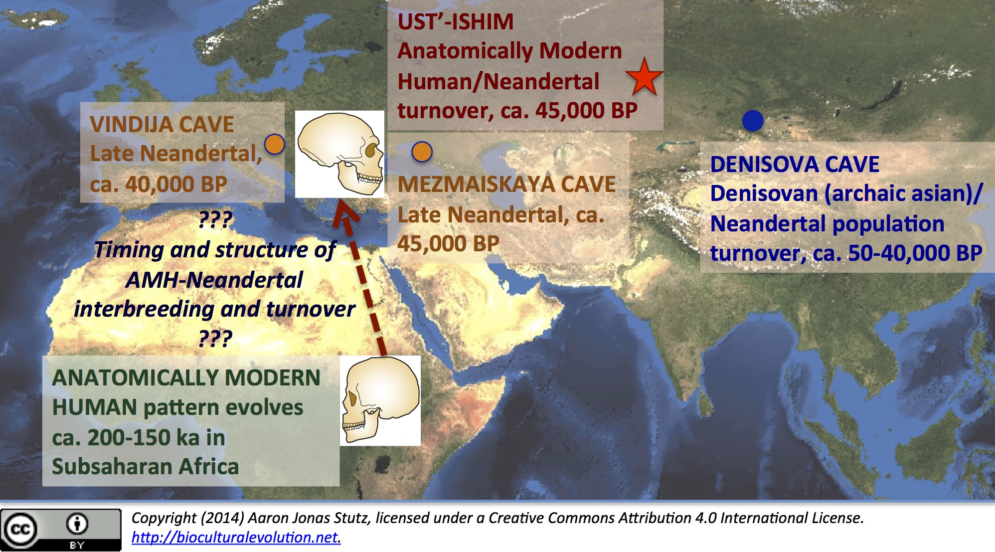 In fact, many people today in Southeast Asia, Melanesia, Polynesia, and aboriginal Australia have a more complex combination of predominantly African background, with small amounts of Neandertal and Asian archaic [so-called “Denisovan”] ancestry (Reich et al., 2010, 2011). Notably, the Ust’-Ishim genome includes no distinctive Denisovan/archaic asian markers. This may be because the Ust’-Ishim male lived and died a few millennia earlier than the only known Denisovan individual–represented by another remarkably well-preserved ancient genome recovered from a humble isolated finger bone (Reich et al., 2010; Prüfer et al., 2013). And speaking of the “Denisovan” genome from Denisova Cave … It is especially relevant that the “Denisovan” finger bone (ca. 40,000 BP) was found stratigraphically overlying a Neandertal toe bone, which dates to ca. 50,000 BP and also yielded whole-genome DNA (Prüfer et al., 2013). Moreover, the “Denisovan”/archaic asian genome preserves evidence of a small amount of Neandertal ancestry. It looks like Denisovan populations also expanded northward, interbreeding with … and then replacing indigenous Neandertals in the Altai Mountains, ca. 40,000 BP. The geographic relationship between Ust’-Ishim and Denisova Cave is shown in the figure below.