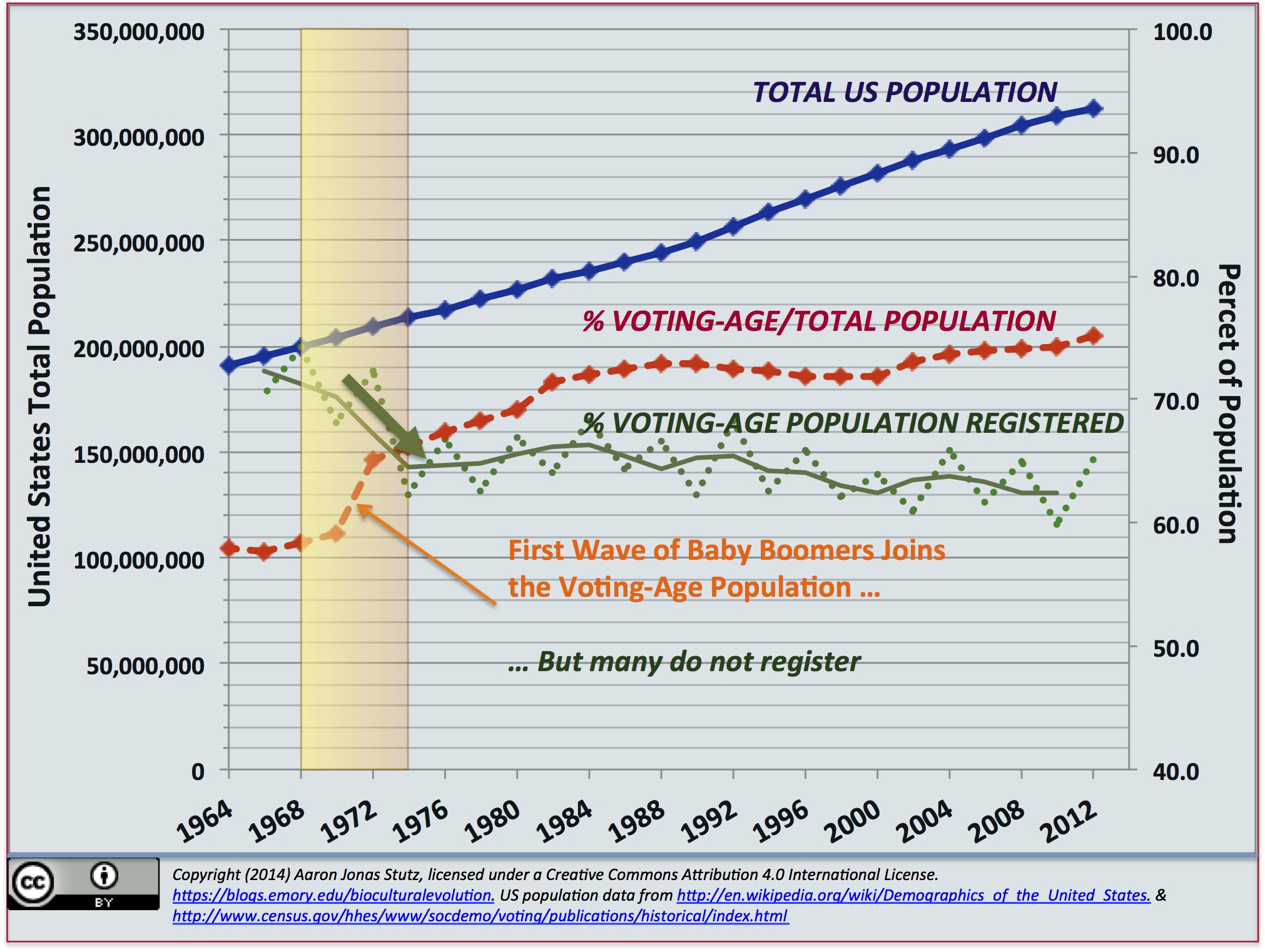 This statistical, population-level connection between economic marginalization and non-voting raises the question about the connection between better economic inclusion and greater democratic participation. When we take a longer-term biocultural and demographic perspective, it becomes clear that the modern era of lower registration and voter turnout rates was strongly shaped by the post-World War II baby boomers beginning to enter the voting-age population in the mid-late 1960’s. Many of the young people then swelling the numbers of eligible voters … well, they didn’t rush out to register to vote.