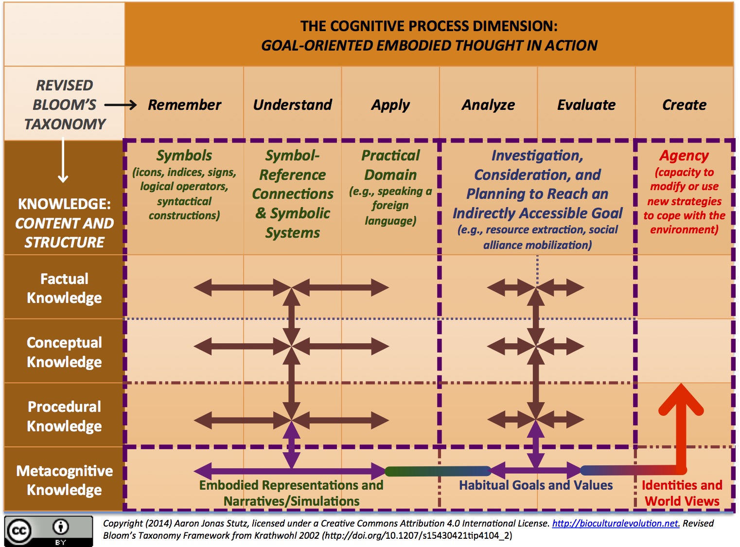 But note also that when we ourselves get into the analyze-and-evaluate zone, we can contrast what’s involved with remembering, understanding, and applying with analyzing and evaluating. It becomes clear why we need more of certain early undergraduate learning experiences. What are now called in the trade “high-impact learning experiences” can catalyze more thorough embodied and socially contagious transformations in our students. When students use analysis and evaluation goals and techniques–rather than rote memorization or repetition–they better learn facts, concepts, and procedures. They own their particular unique story of achieving their understanding. In doing so, they develop the motivation and reason to apply emerging knowledge.