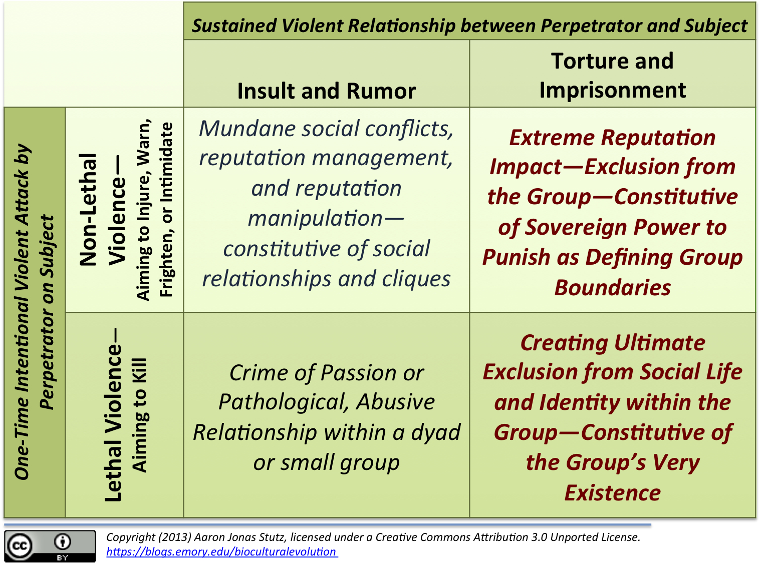I would suggest that the experience of violence–whether from the perspective of the perpetrator or the subject of violent attack tends to resolve around two dimensions. One is the severity of a single act intended to hurt someone physically. The goal may range on a continuous scale, from hurting someone enough to scare or bruise them to hurting them in order to take their life. The other dimension is intentionally hurting someone so that their life–and for humans, this so profoundly means their social life–possibilities are altered and constrained. This dimension is much more complex, and it can involve symbolic taunts, rumors, and insults … but it can also include torture, imprisonment and slavery. This latter dimension is important to think about from the perspective of biocultural evolution. Humans are particular long-lived, compared to apes of similar or larger body size (chimps, bonobos, gorillas, and orangutans). And we live particularly socially intense lives, in which the symbolically shared, inferred, shaped, and reshaped narratives about past, ideal, and possible future lives have a huge impact on the constitution of society. Humans are typically stuck with others over the life-course for decades, which makes shaming, torture, or imprisonment a different kind of violence than the immediately lethal variety. Of course, violence of the latter sort can contribute to the experience of exclusion by social kin of the victim(s). Altogether, these forms of violence allow humans to enact, remember, imagine, retell, and embody dramas of social exclusion. We don’t have to enact or contribute to such stories, but they are indeed dramatic stories that shape our fundamental access to social resources over the long-term. Violence has profound repercussions, because it can effectively bring a group together. Violence has plagued American culture over time. I am currently visiting old friends outside of Taos, New Mexico, and here, the history of violence in Anglo, Mexican, and Indian relations is painfully present. In my hometown of Atlanta, Georgia, though, it is the history of violence against African Americans that is constantly present. In both cases, violent exclusion–whether slavery, land confiscation, the ethnic cleansing of the Trail of Tears, the long history of segregation–was a kind of ritually effective drama that drew the boundaries of democratic America.