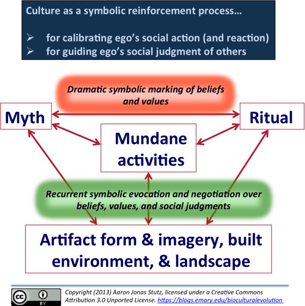 I would add that my own undergraduate and graduate training (in the late 1980’s and 1990’s) as an anthropological archaeologist made me well aware of the deep biological-cultural intellectual divide. Archaeologists have an interest in theoretically understanding how symbolic systems structure social action and judgment, while also allowing for creativity and agency. The problem, of course, is that archaeological traces preserve little direct evidence of such cultural symbolic systems, let alone the dynamic political discourse–involving shifting alliances, changes in beliefs and values about power and obligations, and struggles of domination and resistance–that might have influenced empirical patterns in those archaeological traces. But archaeology provides a distinctive perspective on the results of cultural dynamics over centennial or millennial timescales. And thus, archaeological inquiry demands a theoretical framework in which culture is not necessarily the stable, coherent system implicit in the traditional Boasian framework. I am especially interested in the idea of biocultural evolution because it is a way to reintegrate anthropology as an umbrella discipline. From a biological perspective, my point of departure is that culture is a complex embodied adaptation that is integrated into a life history adaptation. From a cultural anthropological perspective, culture is a process of symbolically structured social action, judgment, and agency. From a long-term, holistic archaeological perspective, culture shapes complex-system dynamics in symbols, values, beliefs, relationships, technology, landscape, demography, and indeed, biology. This allows us to summarize a useful biocultural view of culture, re-tracing a common, intertwined thread. I offer this summary in the figure above left and the two figures below.