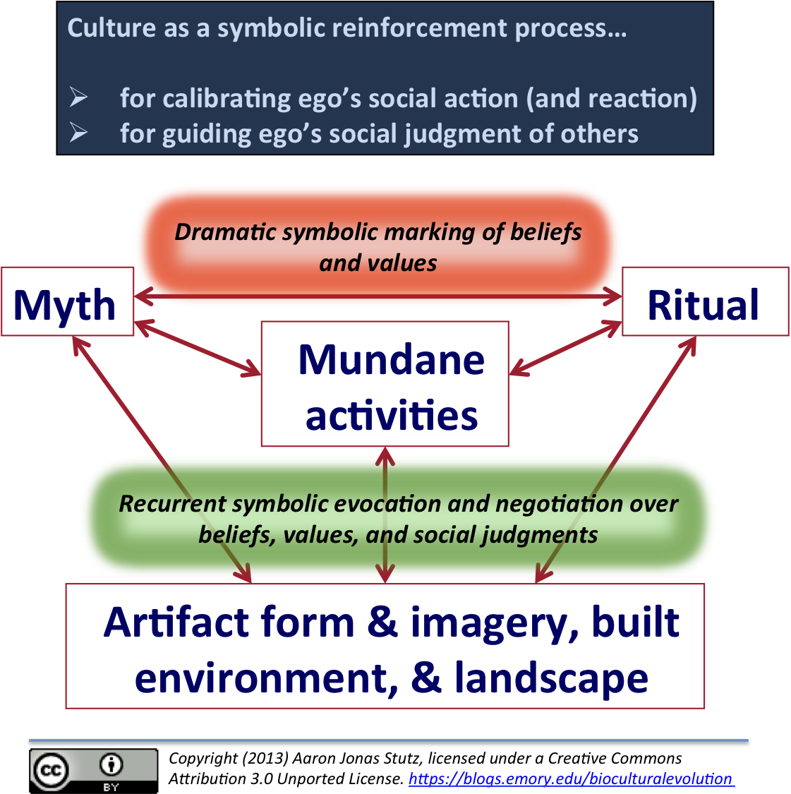I would add that my own undergraduate and graduate training (in the late 1980’s and 1990’s) as an anthropological archaeologist made me well aware of the deep biological-cultural intellectual divide. Archaeologists have an interest in theoretically understanding how symbolic systems structure social action and judgment, while also allowing for creativity and agency. The problem, of course, is that archaeological traces preserve little direct evidence of such cultural symbolic systems, let alone the dynamic political discourse–involving shifting alliances, changes in beliefs and values about power and obligations, and struggles of domination and resistance–that might have influenced empirical patterns in those archaeological traces. But archaeology provides a distinctive perspective on the results of cultural dynamics over centennial or millennial timescales. And thus, archaeological inquiry demands a theoretical framework in which culture is not necessarily the stable, coherent system implicit in the traditional Boasian framework. I am especially interested in the idea of biocultural evolution because it is a way to reintegrate anthropology as an umbrella discipline. From a biological perspective, my point of departure is that culture is a complex embodied adaptation that is integrated into a life history adaptation. From a cultural anthropological perspective, culture is a process of symbolically structured social action, judgment, and agency. From a long-term, holistic archaeological perspective, culture shapes complex-system dynamics in symbols, values, beliefs, relationships, technology, landscape, demography, and indeed, biology. This allows us to summarize a useful biocultural view of culture, re-tracing a common, intertwined thread. I offer this summary in the figure above left and the two figures below.